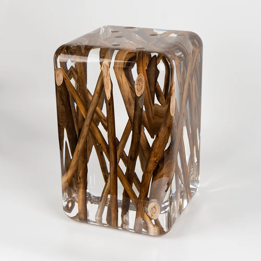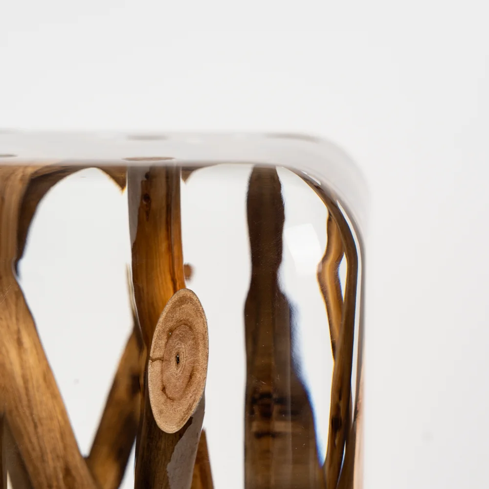 A stunning statement piece for modern living spaces. This luxurious coffee & side table features transparent acrylic with natural wood sticks in a mesmerizing criss-cross lattice. Creates beautiful light play with magnifying effects while adding organic texture. Perfect as a side table, small coffee table, or decorative pedestal.